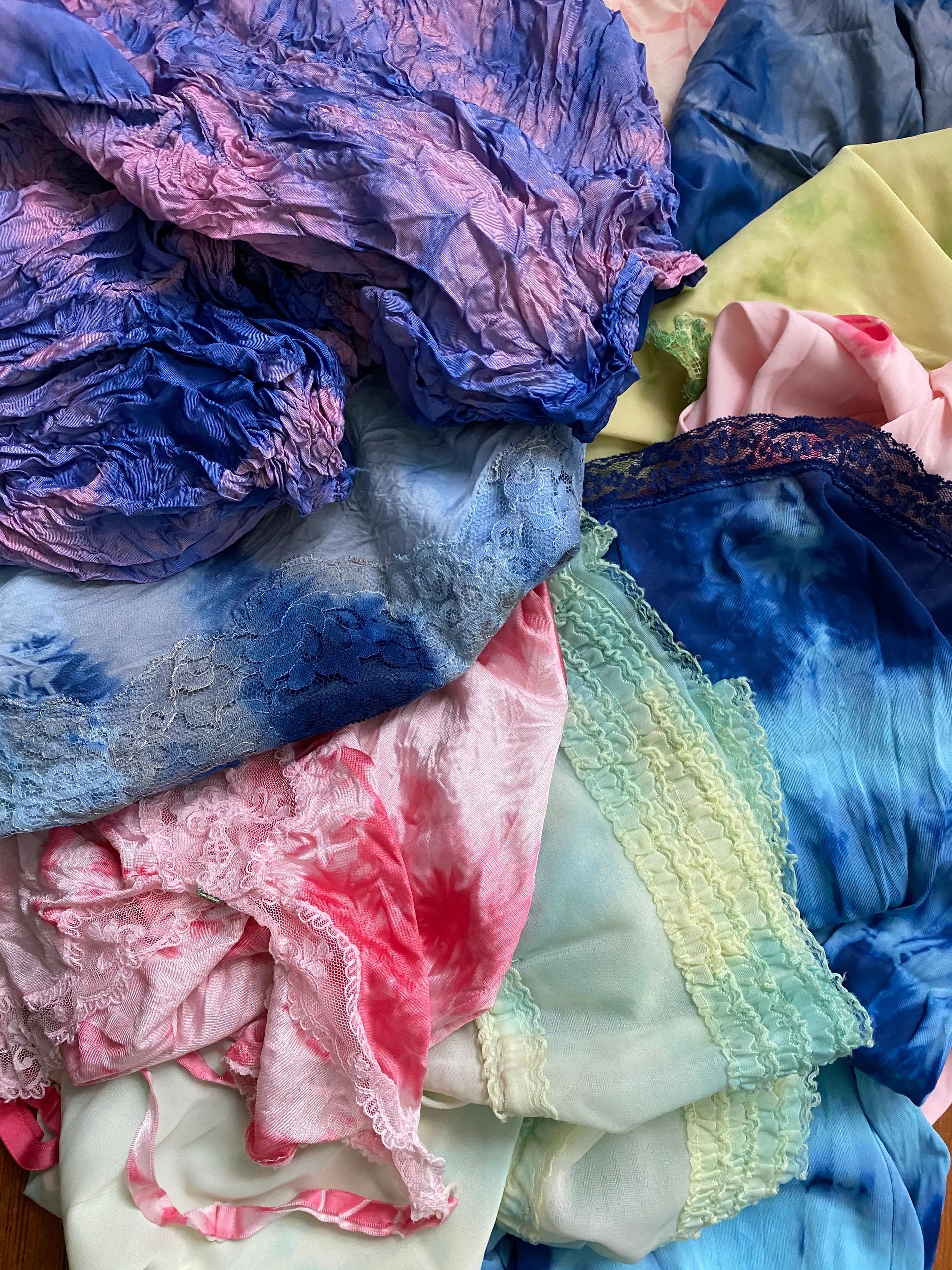 Each of our pieces has been hand dyed at least 3 times to create a unique color combination and pattern. Now, Re-imagine these items worn as Dresses, Tops, Skirts, and most certainly as pretty pieces of lingerie....We did